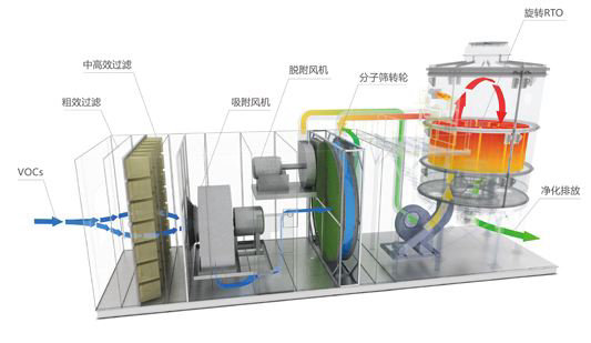 轉(zhuǎn)輪濃縮+RTO燃燒原理:再生后沸石轉(zhuǎn)輪重新投入使用,通過控制脫附過程流量可將有機廢氣濃度濃縮10-20倍,脫附氣流經(jīng)蓄熱床的加熱器裝置加熱至760℃左右,燃燒過程凈化效率可達99%以上,燃燒后生成CO2 和H2O 并釋放出大量熱量,該熱量通過蓄熱床內(nèi)的蓄熱體儲存起來,用來再次加熱脫附出的高濃度廢氣,另外一部分用來加熱空氣做為沸石轉(zhuǎn)輪的脫附氣體使用。?
