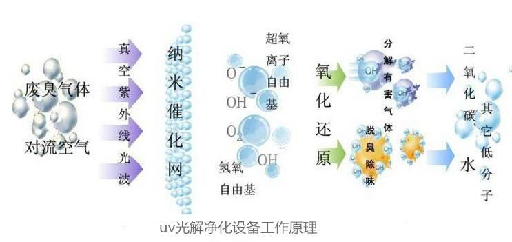 特制UV紫外線燈:利用特制的高能高臭氧UV紫外線光束照射廢氣,裂解工業(yè)廢氣如:氨、硫化氫、甲硫氫、甲硫醇、甲硫醚、乙酸丁酯、乙酸乙酯、二甲二硫、二硫化碳和苯乙烯,硫化物H2S、VOC類,苯、甲苯、二甲苯的分子鏈結(jié)構(gòu),使有機(jī)或無(wú)機(jī)高分子惡臭化合物分子鏈,在高能紫外線光束照射下,降解轉(zhuǎn)變成低分子化合物,如CO2、H2O等。利用高能高臭氧UV紫外線光束分解空氣中的氧分子產(chǎn)生游離氧,即活性氧,因游離氧所攜正負(fù)電子不平衡所以需與氧分子結(jié)合,進(jìn)而產(chǎn)生臭氧。 UV+O2→O-+O*(活性氧)O+O2→O3(臭氧),眾所周知臭氧對(duì)有機(jī)物具有極強(qiáng)的氧化作用,對(duì)工業(yè)廢氣及其它刺激性異味有效果。工業(yè)廢氣利用排風(fēng)設(shè)備輸入到本凈化設(shè)備后,凈化設(shè)備運(yùn)用高能UV紫外線光束及臭氧對(duì)工業(yè)廢氣進(jìn)行協(xié)同分解氧化反應(yīng),使工業(yè)廢氣物質(zhì)其降解轉(zhuǎn)化成低分子化合物、水和二氧化碳,再通過(guò)排風(fēng)管道排出室外。利用高能-C光束裂解工業(yè)廢氣中細(xì)菌的分子鍵,破壞細(xì)菌的核酸(DNA),再通過(guò)臭氧進(jìn)行氧化反應(yīng),達(dá)到凈化及殺滅細(xì)菌的目的。