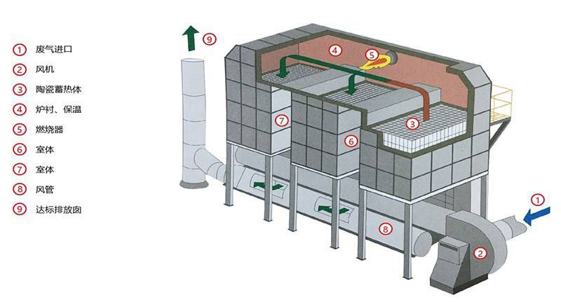 RTO廢氣處理設(shè)備原理是把有機(jī)廢氣加熱到760攝氏度(具體需要看成分)以上,使廢氣中的VOC氧化分解成二氧化碳和水。氧化產(chǎn)生的高溫氣體流經(jīng)特制的陶瓷蓄熱體,使陶瓷體升溫而“蓄熱”,此“蓄熱”用于預(yù)熱后續(xù)進(jìn)入的有機(jī)廢氣。從而節(jié)省廢氣升溫的燃料消耗。陶瓷蓄熱室應(yīng)分成兩個(含兩個)以上,每個蓄熱室依次經(jīng)歷蓄熱-放熱-清掃等程序,周而復(fù)始,連續(xù)工作。蓄熱室“放熱”后應(yīng)立即引入適量潔凈空氣對該蓄熱室進(jìn)行清掃(以保證VOC去除率在百分之98以上),只有待清掃完成后才能進(jìn)入“蓄熱”程序。否則殘留的VOCS隨煙氣排放到煙囪從而降低處理效率。
